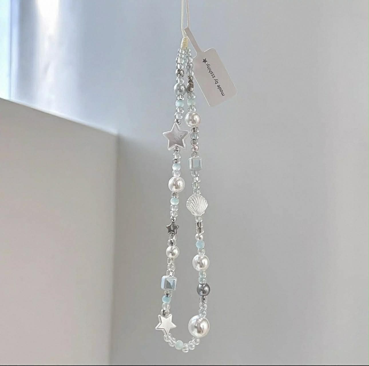 This handcrafted beaded strap features a soft mix of pastel blue, white, and pearl-like beads for a delicate, dreamy look. Lightweight yet durable, it can be used as a phone strap, camera strap, or decorative accessory. Finished with charming star and crystal details, itβs perfect for everyday use or gifting.